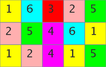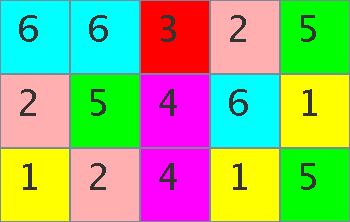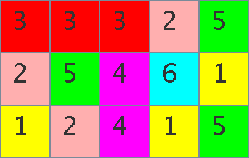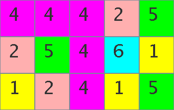 Since many panels are simultaneously synthesized and generated on a base plate through some complex chemical processes, the fabricated panels are randomly colored and they are arranged in a rectangular shape on the base plate (Figure C-1). Note that the two purple (color 4) panels in Figure C-1 are already united at the initial state since they are adjacent to each other.