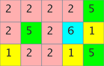 In order to check the strength of united panels with various sizes and colors, he needs to unite as many panels as possible with the target color. Your job is to write a program that finds a sequence to change the colors five times in order to get the largest united panel with the target color. Note that the electrodes are fixed to the panel at the upper left corner.