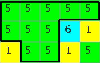 Dr. Fukuoka has invented fancy panels. Each panel has a square shape of a unit size and has one of the six colors, namely, yellow, pink, red, purple, green and blue. The panel has two remarkable properties. One property is that, when two or more panels with the same color are placed adjacently, their touching edges melt a little and they are fused each other. The fused panels are united into a polygonally shaped panel. The other property is that the color of a panel can be changed to one of six colors by giving an electrical shock. The resulting color can be controlled by its waveform. The electrical shock to an already united panel changes the color of the whole to a specified single color.