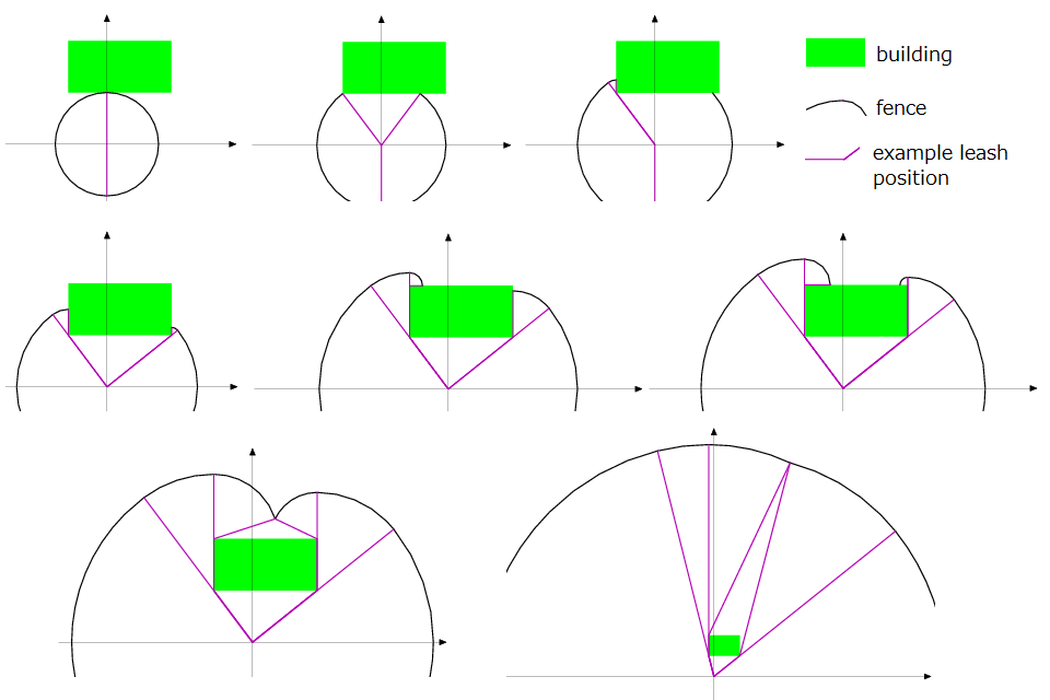 Given the length of the leash and the position and the size of the building, your program should calculate the length of the fence.