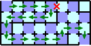 There is a rectangular maze consisting of a number of square rooms arranged in grid. The maze is surrounded by walls except for its entry and exit. The entry to the maze is at the leftmost part of the upper side of the rectangular area, that is, the upper side of the uppermost leftmost room of the maze is open. The exit is located at the rightmost part of the lower side, likewise.