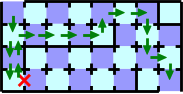 However, you can pass through the maze with less cards. You should follow the path in Figure G-5, until you find the broken door. The path is not the shortest path because it needs twelve cards at least. After you've found a broken door on the path, you should follow the shortest path to the exit that doesn't use the broken door. With this strategy, you can pass the maze with sixteen cards whichever door is broken. Figure G-6 shows one of the worst cases of this strategy; it needs sixteen cards.