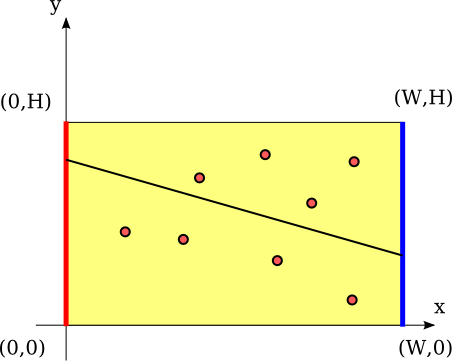 せっかくなので,博士は二人にケーキを切らせることにした. イコとピコは協力してケーキを切るため,イコが包丁の一端を辺(0,0)-(0,H )の間におき,ピコはもう一端を辺(W ,0)-(W ,H )の間において同時に下に下ろすという方法をとることにした. もちろん包丁は直線状なので,選んだ2点を通る直線でケーキは2つに分かれる.(図E-1)
