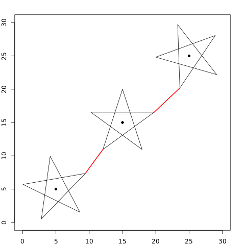 図 D-2の左の星はx=5, y=10, a=0, r=5の星を表しており、右の星はx=15, y=10, a=30, r=5の星を表している。